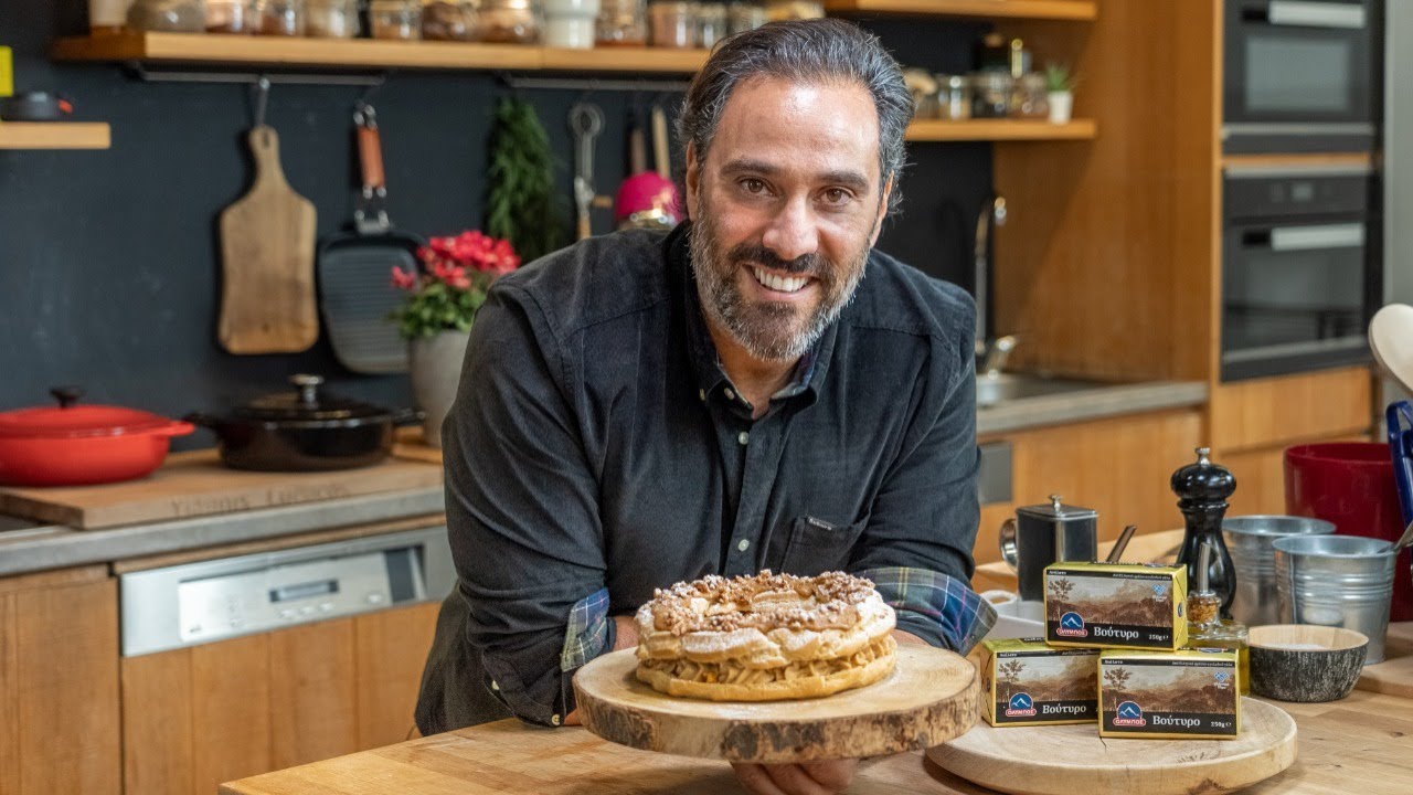 Cut the baked choux in the 2 baking trays in the middle of their size. Fill each choux base with 40 gr. of hazelnut spread, then with 300 gr. hazelnut cream and 40 gr. of the caramelized hazelnuts. Cover each of the choux top alongside with 30 gr. hazelnut spread and add the rest of the hazelnuts evenly over the hazelnut spread by slightly pressing them down to stay. Use the top choux part to cover the layers and sprinkle with some icing sugar on top. Serve in any plate you like!