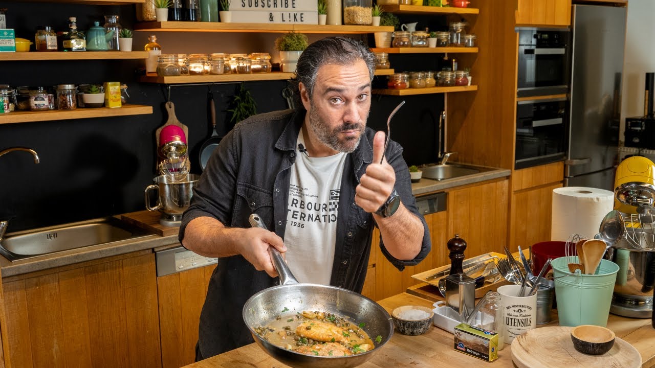 Αφαιρούμε το κοτόπουλο από το τηγάνι, προσθέτουμε την κάπαρη, σβήνουμε με το κρασί και το αφήνουμε να εξατμιστεί. Προσθέτουμε τον ζωμό και μαγειρεύουμε μέχρι να συμπυκνωθεί η σάλτσα κατά το ήμισυ.