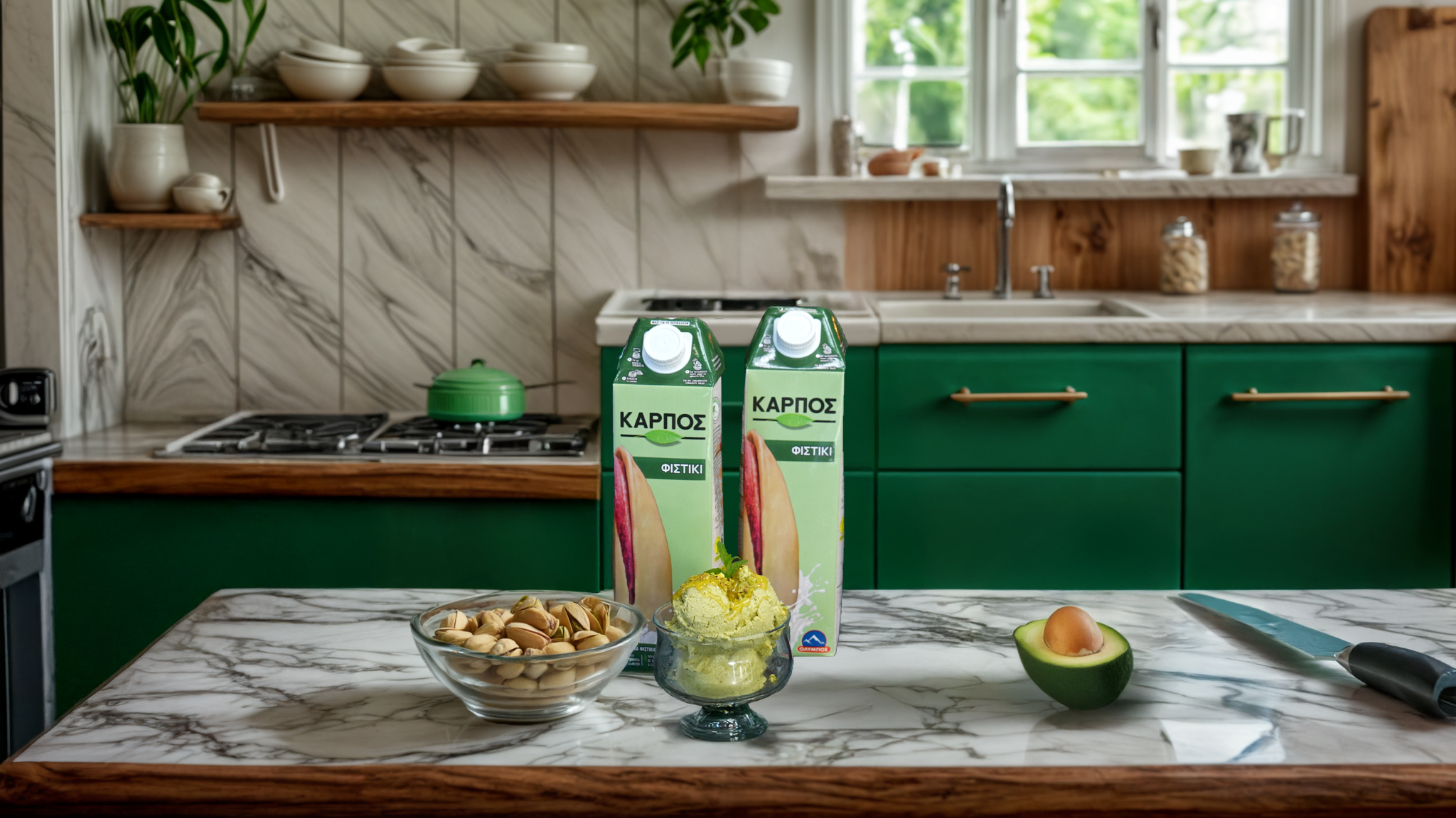 Στην κανάτα του μπλέντερ ρίχνουμε το τυρί cottage, το Ρόφημα ΚΑΡΠΟΣ Φιστίκι ΟΛΥΜΠΟΣ, το μέλι, το avocado, τα καβουρδισμένα φιστίκια, τις βανιλίνες και χτυπάμε πολύ καλά μέχρι να έχουμε ένα λείο παχύρευστο μείγμα.